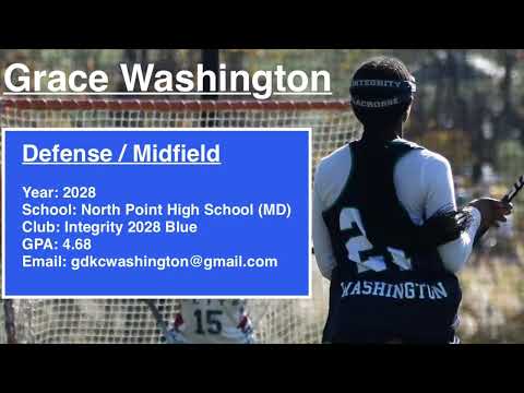 Grace Washington Midfield / Defense Women's Lacrosse Year: 2028 School: North Point High School (MD) Club: Integrity 2028 Blue GPA: 4.68 Email: gdkcwashington@gmail.com Instagram: gracew_21_lacrosse